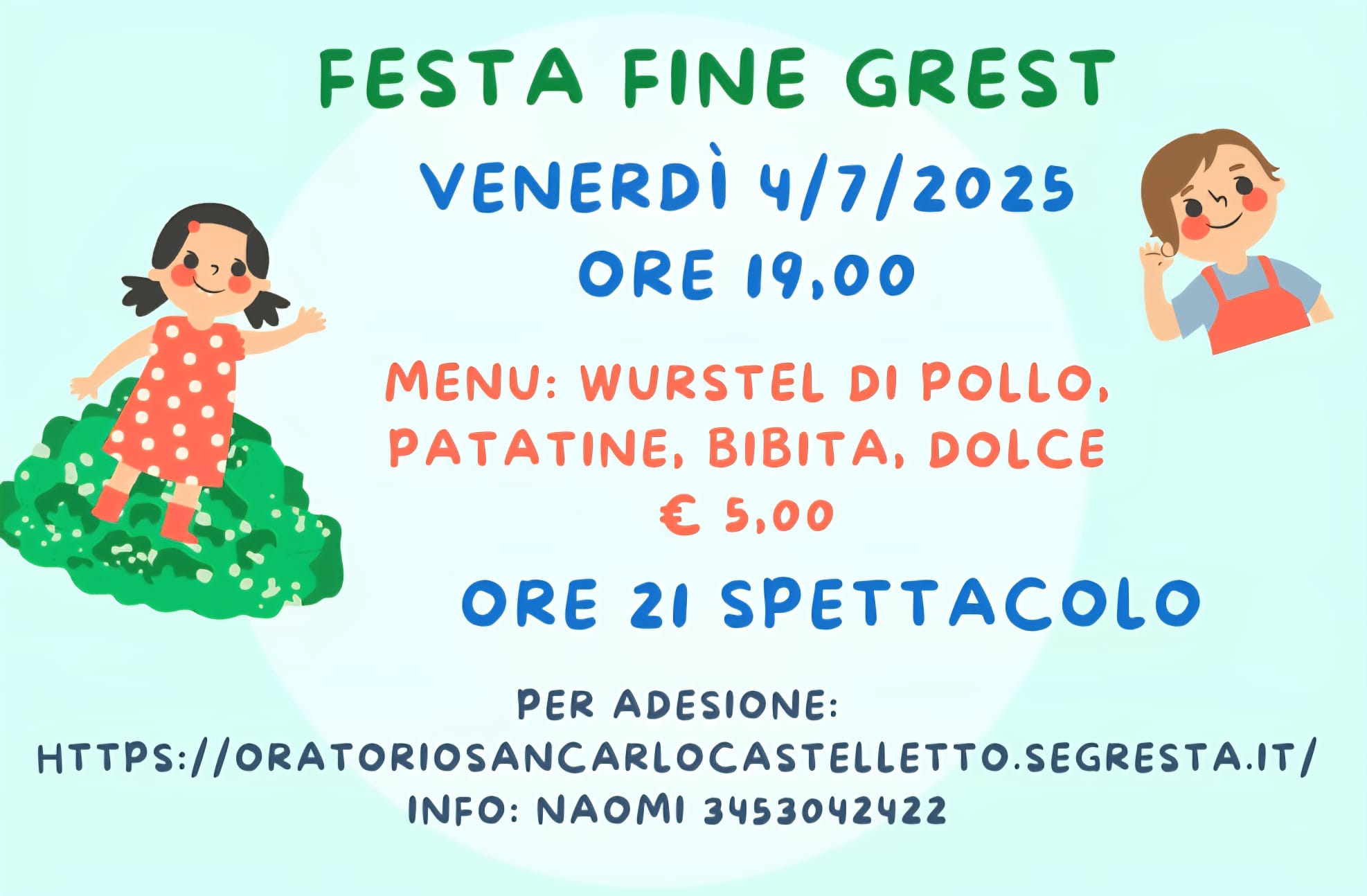 Menù di fine grest: wurstel di pollo, patatine, bibita e dolce 5€ ore 19